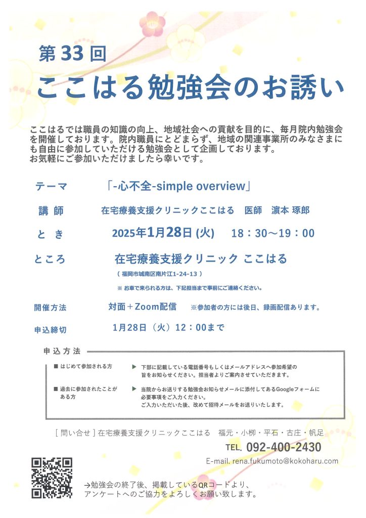 ここはるでは、職員の知識向上、地域の皆様への情報提供の一環として、院内勉強会を開催しております(会場+Zoom配信)。